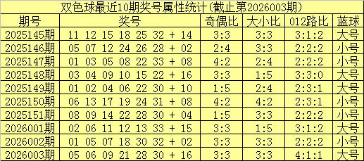奇偶分析:上期红球奇偶比开出3:3,奇偶红球开出个数相等,最近10期奇偶红球总比例为27:33,偶数红球出现较多,本期预计偶数红球继续热出,看好奇偶比0:6。