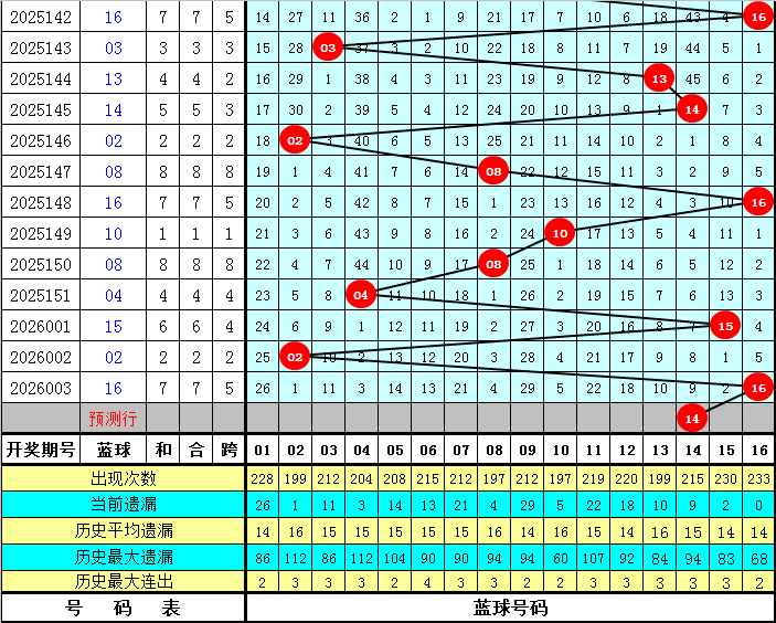 遗漏分析:最近7期红球遗漏总值分别为:18、42、42、23、19、29、26,开出5个遗漏值9以上的冷码红球,目前红球遗漏值9以上的冷码红球有5个:16、20、23、27、29,本期注意冷码解冻,参考红球号码20、27。