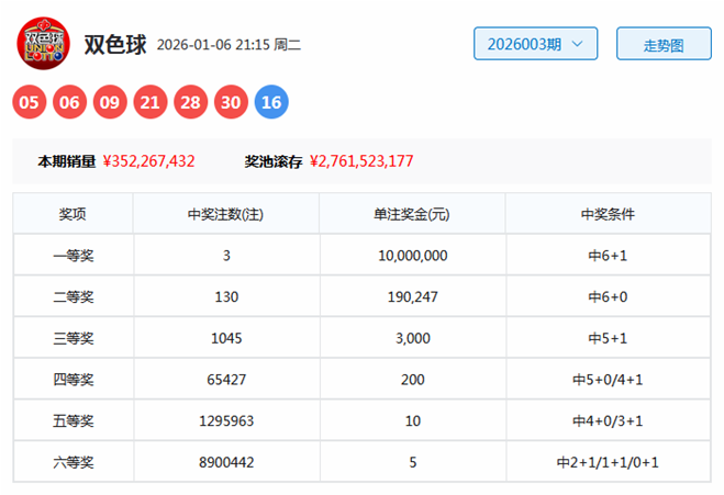 开奖回顾:双色球第2026003期奖号为:05 06 09 21 28 30 + 16,其中红球号码奇偶比为3:3,大小比为3:3,012路比为4:1:1,三区比为3:1:2。