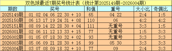 开奖回顾:双色球第2026004期奖号为:03 07 08 09 18 32 + 10,红球和值为77,奇偶比为3:3,大小比为2:4。蓝球开出偶数。