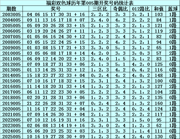 在第005期历史同期奖号中,红球三区分布总比例为41:51:46,奇偶总比例为68:70,012路比为49:44:45,和值分布在57-160之间,蓝球号码012路总比例为9:10:4。