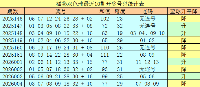 上期开奖:福彩双色球第2026004奖号开出:03 07 08 09 18 32 + 10,红球号码和值为77,首尾间距为29,包含连号:07 08 09。