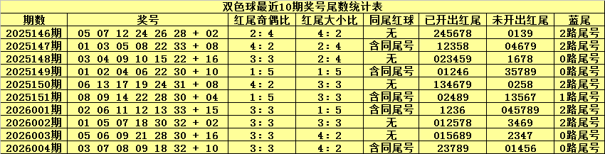 双色球第2026004期奖号为:03 07 08 09 18 32 + 10,红球尾数为:23789,包含同尾红球:08 18。