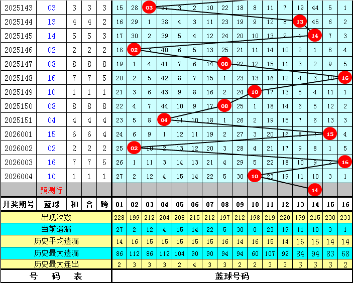 前九周星期日开出8个蓝球号码,蓝球以冷码为主,热码蓝球开出相对较少,还没有出现的蓝球为:01、04、05、07、09、12、14、16,共8个,本期防近几周星期日没有开出的冷码蓝球回补,参考蓝球号码14。