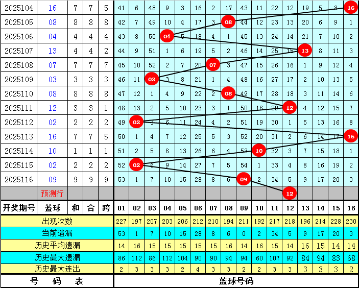 蓝球走势分析:上周日第25114期蓝球开出号码10,最近十周星期日蓝球号码大小比为6:4,奇偶比为1:9,012路比为2:5:3。本期蓝球重点关注偶数号,看好蓝球08、12。