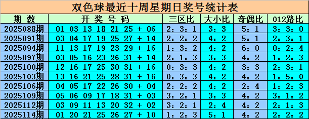 三区间分布分析:上周日第25114期奖号为:01、20、21、25、26、27+10,区间比为1:2:3。本期热区关注红一区,关注区间比:3:2:1。