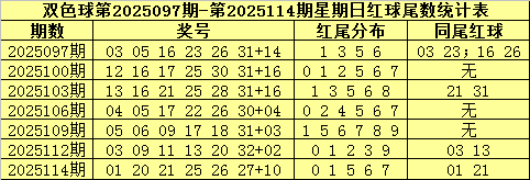 蓝球尾数分析:最近7周星期日开出5个蓝球尾数,重复蓝球尾数明显活跃,本周星期日排除近期已出现的蓝球尾数,注意温冷蓝球尾数回补,关注蓝球16。