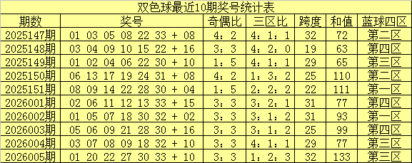 双色球第2026005期开出奖号:01 20 22 27 30 33 + 10。其中红球三区比为1:2:3,和值为133,奇偶比为3:3,跨度为32,蓝球出现在第三区。