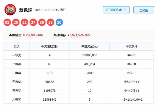 双色球第2026005期奖号为:01、20、22、27、30、33+10。