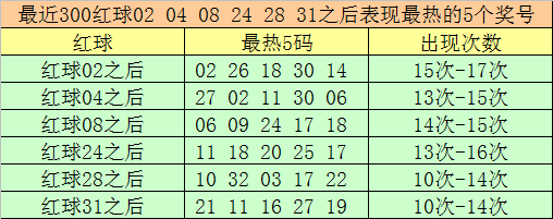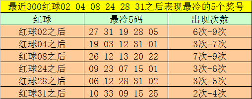 红球冷码统计:双色球第2025116期开出红球奖号分别为:02、04、08、24、28、31,在最近300期开奖中,各号码出现之后其下期出现最少的5个红球分别为: