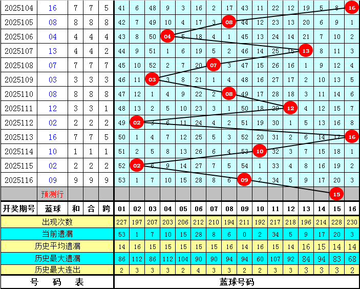 上期开出蓝球号码09,该号码在最近300期中出现了10次,其下期分别开出:蓝球03、14出现2次,蓝球06、07、08、11、12出现1次,蓝球01、02、04、05、09、10、13、15、16出现0次。本期五码蓝球参考01、02、10、12、15,独蓝关注15。