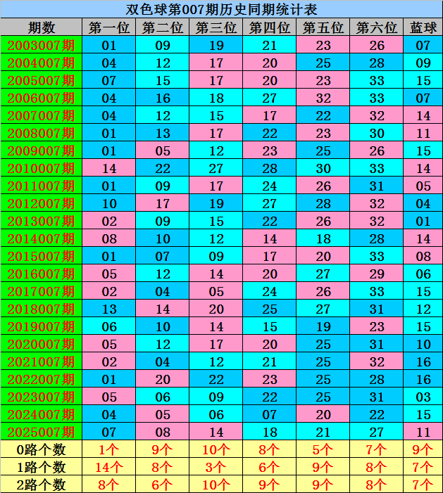 第二位:历史同期0路红球开出:06、09、12、15;1路红球开出;04、07、10、13、16、22;2路红球开出;05、08、14、17、20,红球012路个数比为9:8:6,当前0路红球历史同期轮空2年,今年同期注意0路红球出现,参考号码09。