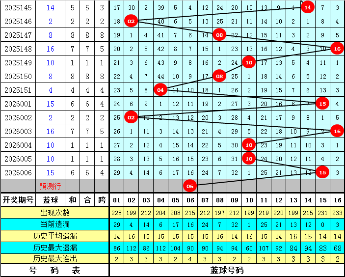 蓝球分析:前5期蓝球号码分别开出:02、16、10、10、15,其中偶数蓝球开出了4次,出现比例较高,本期预计蓝球再出偶数,参考蓝球号码06。