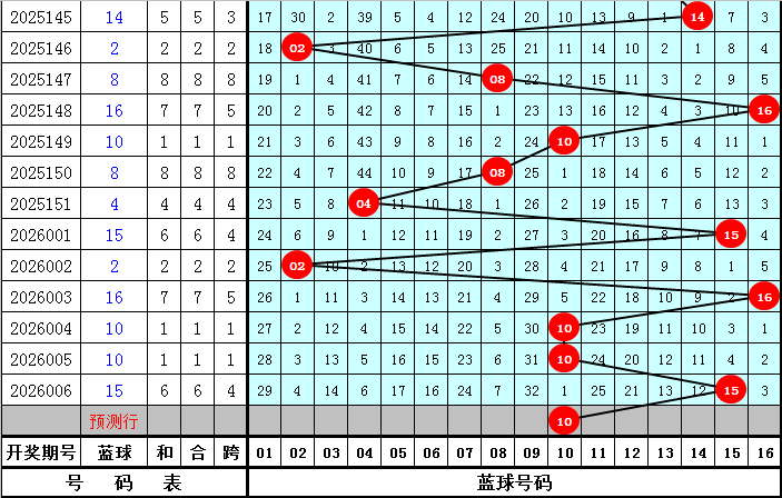 蓝球分析:上期蓝球奖号开出15,为大号,上周四蓝球奖号开出10,最近十周四蓝球号码大小比为4:6,小 号蓝球表现活跃,本周四适当关注大号蓝球回补,看好蓝球号码10、13、14、15、16。