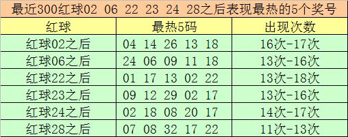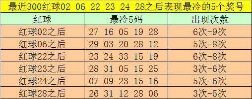 红球冷码统计:双色球第2026006期开出红球奖号分别为:02、06、22、23、24、28,在最近300期开奖中,各号码出现之后其下期出现最少的5个红球分别为:
