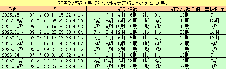截止双色球第2026006期,最近10期红球遗漏总值分别为:18期、42期、42期、23期、19期、29期、26期、12期、34期、28期,上期遗漏总期数偏高。