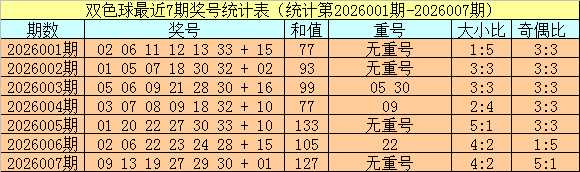 开奖回顾:双色球第2026007期奖号为:09 13 19 27 29 30 + 01,红球和值为127,奇偶比为5:1,大小比为4:2。蓝球开出奇数。