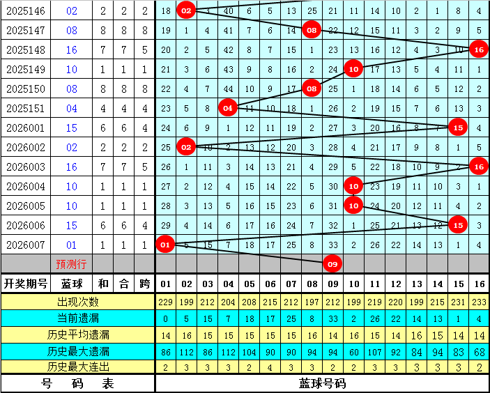 蓝球:上期蓝球号码为01,开出奇数、小 号,蓝球最近7期大小比为5:2,本期注意大号蓝球出现,蓝球关注09。