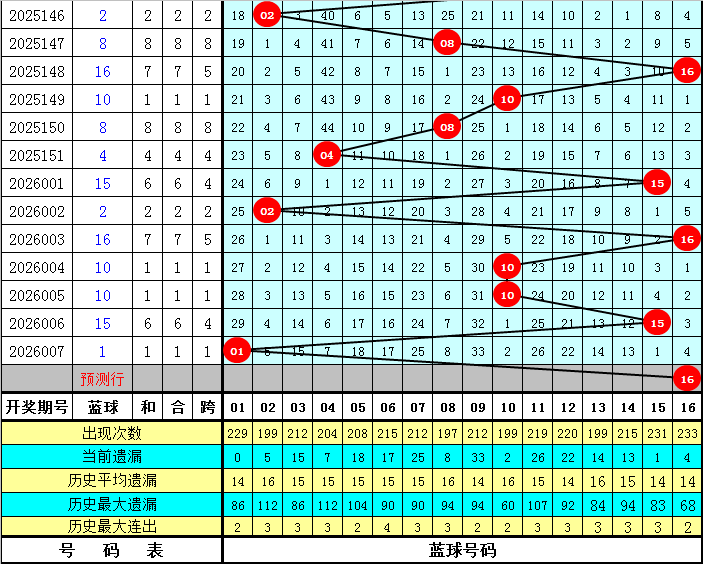 蓝球分析(定义:01-04为一区,05-08为二区,09-12为三区,13-16为四区):上期蓝球开出一区号码01,最近10期蓝球四区落号比为3:1:3:3,总体上二区蓝球较少,一、三、四区蓝球表现较热,本期蓝球看好在第四区开出,独蓝参考16。