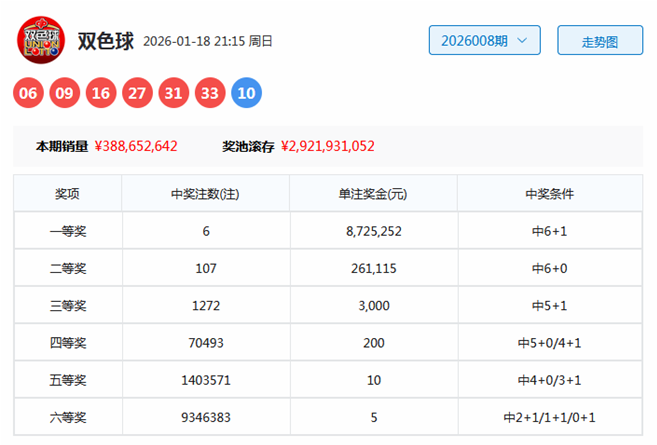 开奖回顾:第2026008期双色球奖号为06、09、16、27、31、33+10。区间比:2:1:3,奇偶比:4:2,首尾间距:27。