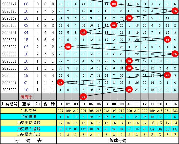 蓝球号码分析:上期蓝球为10,开出1路号码,蓝球最近10期012路比为2:6:2,最近30期012路比为10:12:8,最近100期012路比为28:39:33,本期蓝球看好1路号码,四码蓝球参考04、07、10、16。