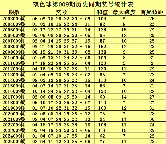 最大跨度推荐:在第009期历史同期开奖中,红球最大跨度全部在5-17之间开出,今年同期预计开出高位最大跨度,关注最大跨度15。