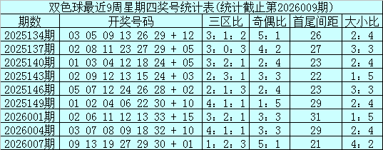 上期开奖:福彩双色球第2026009期奖号为:03 06 13 19 23 25 + 10,其中红球三区比为2:2:2,奇偶比为5:1,首尾间距为22,大小比为3:3。
