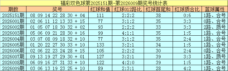 福彩双色球第2026009期红球奖号为:03、06、13、19、23、25,蓝球奖号为:10,其中红球和值为89,012路比为2:3:1,首尾和为28,质合比为4:2,蓝球属性为1路、合号。