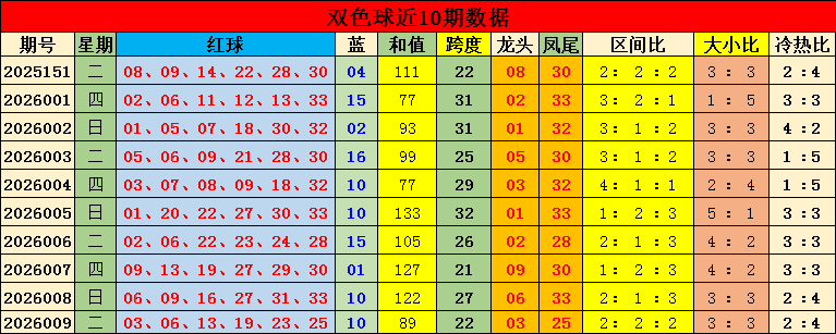 跨度分析:上期红球跨度为22,近10期最大跨度为32,最小跨度为21,跨度平均值为26.6。本期看好跨度开出:32。
