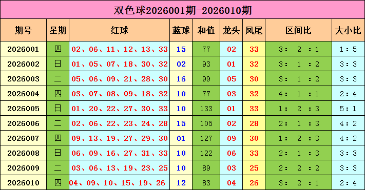 双色球上期开奖号码回顾:红球04 09 10 15 19 26;蓝球12,红球号码大小比为2:4,三区比为3:2:1。蓝球开出大偶数12。