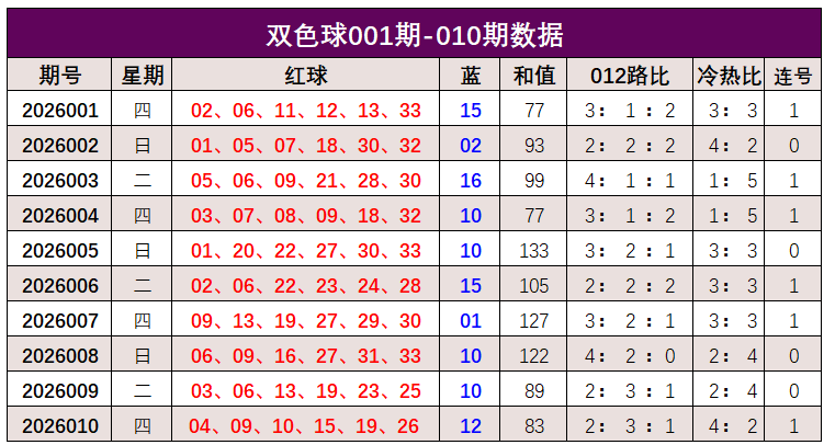 双色球第2026010期开奖奖号:红球06、09、16、27、31、33,蓝球10。红球和值122,012路比4:2:0,冷热比2:4,未开出连号。
