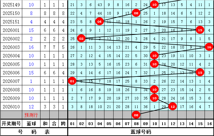 蓝球分析:上期蓝球为大号12,最近10期大号蓝球开出8次,小 号蓝球开出2次,小 号蓝球出现较少,本期注意回补,看好蓝球08。