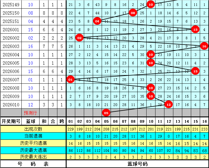 蓝球分析:最近9周星期日蓝球分别开出号码:10、15、06、13、08、08、02、10、10,本周星期日看好蓝球开出奇数号码,参考蓝球号码05。