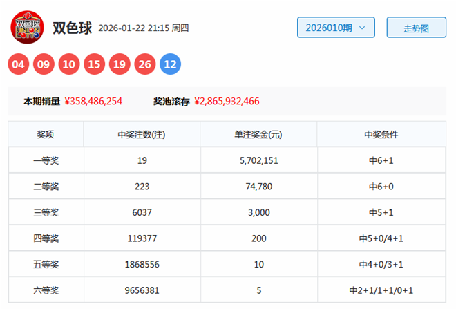 双色球第2026010期奖号为:04、09、10、15、19、26+12。
