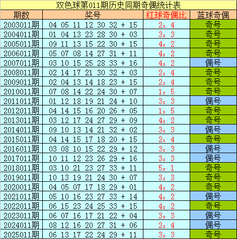 蓝球分析:在第011期历史同期开奖中,蓝球号码奇偶比为15:8,最近5年同期奇偶走势为:偶、奇、偶、偶、奇,今年同期注意偶数蓝球回补,关注号码08。