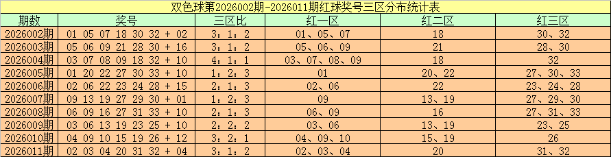 双色球第2026011期奖号为:02 03 04 20 31 32 + 04,红球三区比为3:1:2。
