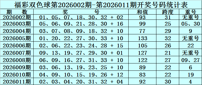 双色球第2026011期奖号开出:02、03、04、20、31、32 + 04,红球号码和值开出92,跨度开出30,开出重号1个:4。蓝球为1路号码。